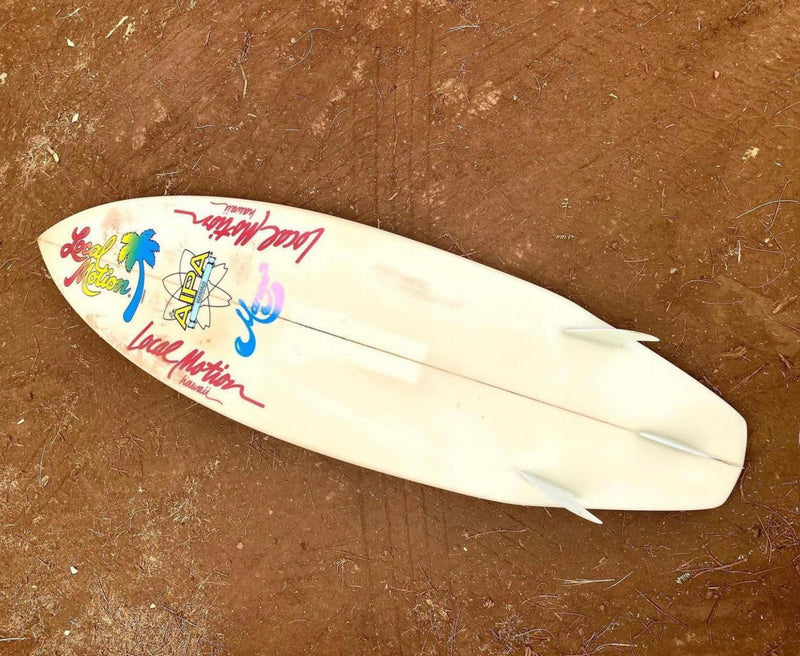 In 1983, thrusters are all the rage, and the Sting had lost popularity momentum. So Ben decided to take the concept of the STING with a shortboard/ thruster look. He decided to break the outline with a high bump instead of a wing. Ben was the coach of the Hawaii surf team at the time and made one these boards for a young Kaipo Guerrero. When Kaipo was in California, it is storied that a certain brands shaper ( not to be named) saw the board and used it as the inspiration to shape a similar board for someone who would become world champ. The copy ended up becoming one of the most popular, top selling boards for this California brand. This Kaipo’s actual board.