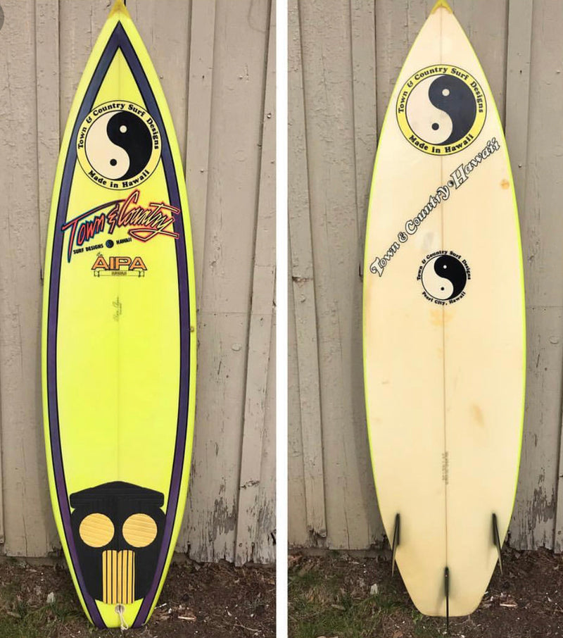 Ben had an opportunity to increase his reach and coach the T&C team comprised of some of the world's best surfers, so he made the decision to partner with Town and Country and shape under the iconic yong yang logo.. It was here in 1985 that the STING made its return , but in a thruster type design for the performance era heading.